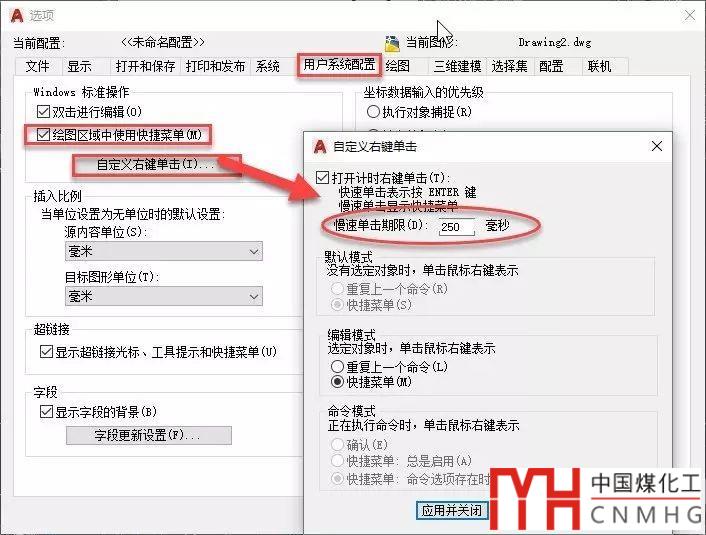 比如我們可以設(shè)置右鍵慢擊和快擊的區(qū)別,快擊的時(shí)候但回車用,慢擊彈快捷菜單。也可以分別設(shè)置沒有選定對(duì)象(默認(rèn)模式)或選定對(duì)象(編輯模式)時(shí)是重復(fù)上一個(gè)命令或顯示快捷菜單。