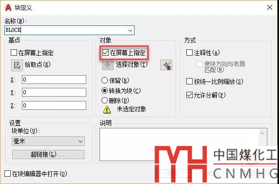 之前遇到有網(wǎng)友說其他命令都沒有問題,只有創(chuàng)建圖塊的時(shí)候才會(huì)有這種現(xiàn)象,剛開始還真沒有想出來是什么原因,最后從他發(fā)過來的塊定義對(duì)話框截圖看出了問題,原來他在圖塊對(duì)話框的對(duì)象參數(shù)中勾選了“在屏幕上指定”,如下圖所示