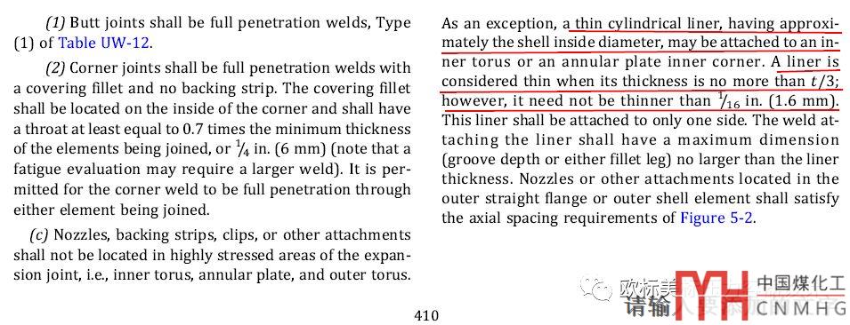 看標(biāo)準(zhǔn)的時候可能你覺得只是改了個名稱,因?yàn)閮?nèi)容里沒有再出現(xiàn)(17)這種17版修改的標(biāo)記;實(shí)際上在制造部分有些修改。修改涉及到的主要是導(dǎo)流筒(內(nèi)襯套)的厚度,還有和膨脹節(jié)焊接的筒體環(huán)縫焊接接頭等。對正常的厚壁膨脹節(jié)來說其它地方的修改是用不到的。我們一定要注意膨脹節(jié)內(nèi)的導(dǎo)流筒(或叫內(nèi)襯套)的厚度是有要求的:小于等于三分之一膨脹節(jié)厚度且大于等于1.6mm。其余的修改見下圖一般情況下用不到也了解一下吧。