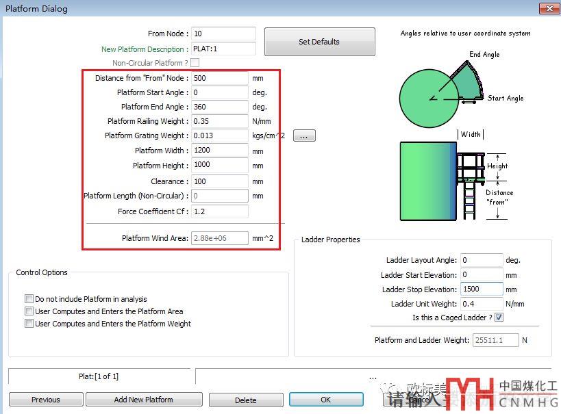PV elite中合適的只有平臺(tái)高度x寬度和1/3高度x寬度的選項(xiàng)。實(shí)際上把1/3改為1/2更合適,因?yàn)檫€有支撐梁。