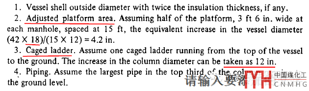 ASME Ⅷ-1中沒(méi)有非受壓件的規(guī)定。但在Bednar的Pressure Vessel Design Handbook中平臺(tái)迎風(fēng)面積高度方向是按18英寸計(jì)算的(應(yīng)該是8英寸支撐型鋼+6英寸包邊角鋼+2英寸圍欄+2英寸扶手),梯子按12英寸寬計(jì)算。