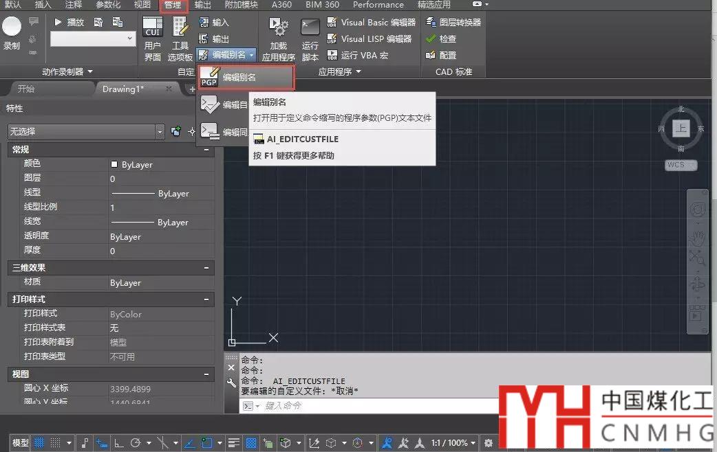 如果你能記得命令名:AI_EDITCUSTFILE,可以直接輸入命令,但高版本這個(gè)命令還可以編輯其他文件,所以你還需要輸入別名的文件名,如acad.pgp,然后才能打開(kāi)PGP文件。