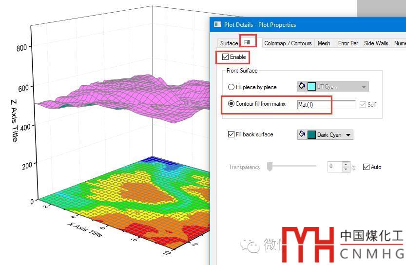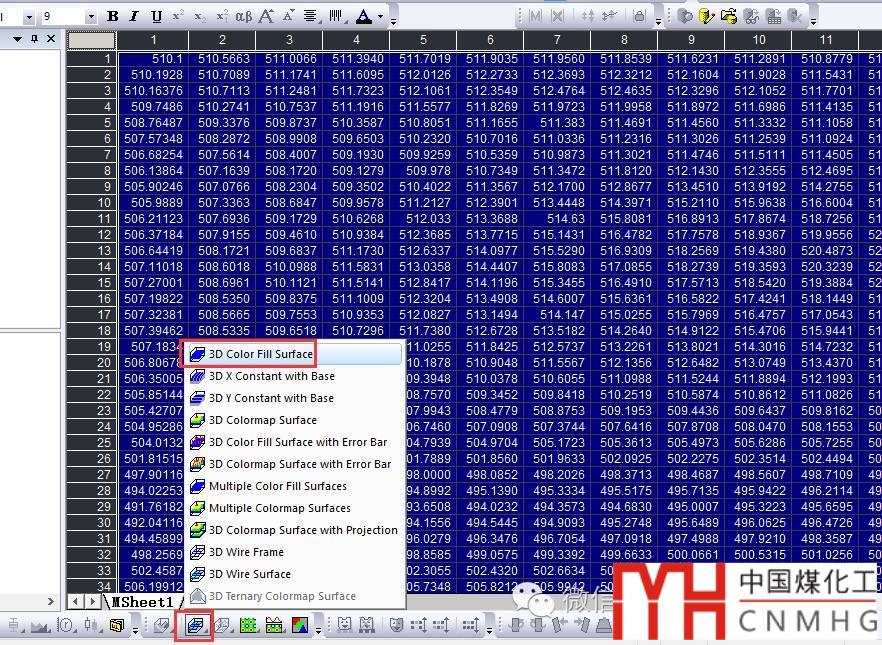 選擇Matrix 數(shù)據(jù),插入3D Color Fill Surface 圖。