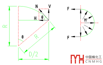 在內(nèi)壓作用下,拱頂球殼與罐壁厚度相等時,拱頂?shù)膹姸葹楣薇诘膬杀?。為使它們強度相當,可使拱頂半徑大致等于罐體的直徑。所以,標準規(guī)定罐頂半徑R取0.8~1.2倍儲罐內(nèi)徑D。在R=1.2D時,θ取得最小值,此時cosθ取得最大值0.909。當R=D時,cosθ=0.868。