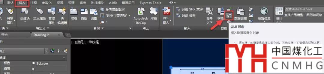 在菜單里選擇:插入>OLE對象,如果用功能區(qū)界面,可以在插入面板中選擇OLE對象,命令是INSERTOBJ,如下圖所示。