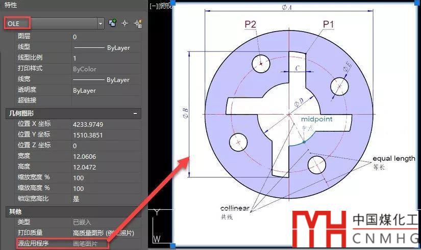 圖片插入好后,直接關(guān)閉畫圖軟件,圖片就會以O(shè)LE的形式嵌入當(dāng)前的DWG文件中。如下圖所示。
