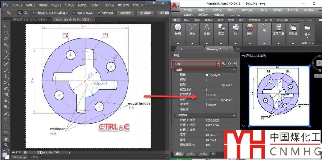 如果安裝了PS,我們用PS打開要插入到CAD的圖像,按CTRL+A全選圖像,也可以框選圖像的一部分,然后CTRL+C將圖像復(fù)制到剪貼板,切換到CAD后CTRL+V就可以將圖像粘貼成OLE對象,如下圖所示。