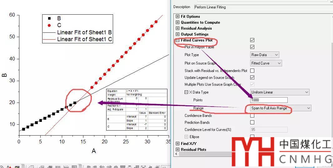 在fitted curves plot選項(xiàng)里,選擇span to FULL axis range,兩條擬合曲線的范圍將是x軸的顯示范圍。