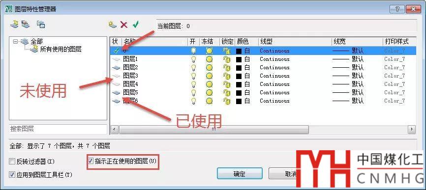 在圖層狀態(tài)列可以通過(guò)圖標(biāo)簡(jiǎn)單判斷一下圖層的狀態(tài),在低版本CAD中只有三種狀態(tài),當(dāng)前層、已使用圖層和未使用圖層,要區(qū)分已使用和未使用圖層,必須要勾選“只是正在使用的圖層”,如下圖所示。