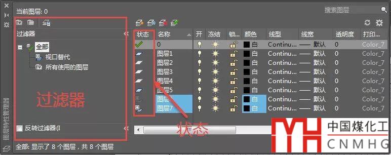 首先要更正一下,圖層過(guò)濾器并不是狀態(tài)之一,而是通過(guò)設(shè)置過(guò)濾條件來(lái)控制圖層列表顯示的內(nèi)容,比如默認(rèn)會(huì)有兩個(gè)過(guò)濾器:全部和所有使用的圖層,如果選擇所有使用圖層,右側(cè)列表中將只顯示圖中已使用的圖層。可以通過(guò)圖層狀態(tài)進(jìn)行過(guò)濾,也可以自己設(shè)置各種特性,如名稱、線型等進(jìn)行過(guò)濾。