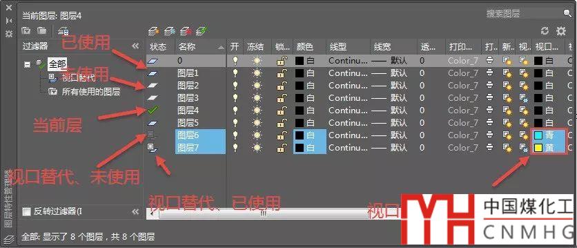 在CAD高版本,如果在布局空間視口沒(méi)有設(shè)置圖層的視口替代特性,在模型空間、布局空間、布局空間視口內(nèi)圖層的狀態(tài)是相同的,只有當(dāng)前圖層,已使用和未使用三種狀態(tài),如果布局某個(gè)視口設(shè)置了替代特性或進(jìn)入了設(shè)置替代特性的視口,圖層就會(huì)出現(xiàn)五種狀態(tài),如下圖所示。