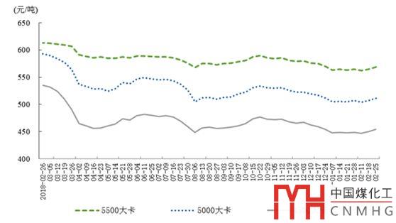 截至2月底,秦皇島港5500大卡煤炭綜合交易價(jià)格為每噸569元,5000大卡煤炭每噸511元,4500大卡煤炭每噸454元,均與上年12月24日基本持平。