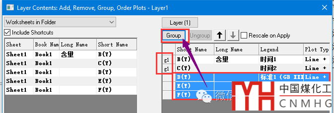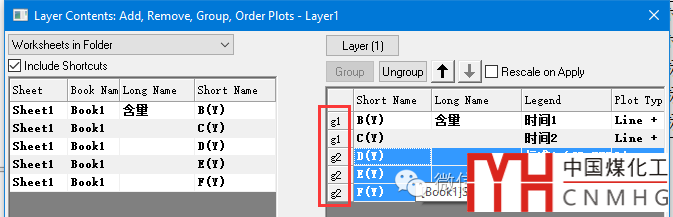 選擇Column圖中的數(shù)據(jù)(本例中是前兩個數(shù)據(jù)),點擊Group,使之組合為g1組