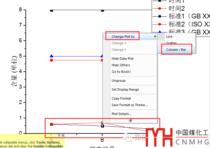 變換圖形類型:右擊需要變換成Column圖的數(shù)據(jù),選擇Change Plot to, Column/bar