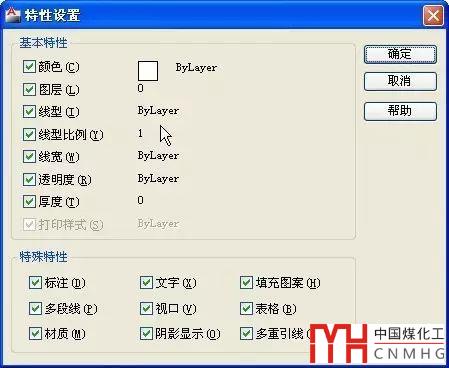 輸入S,可以打開“特性設(shè)置”對(duì)話框,從中可以選擇要將哪些對(duì)象特性復(fù)制到目標(biāo)對(duì)象。默認(rèn)情況下,將選擇“特性設(shè)置”對(duì)話框中的所有對(duì)象特性進(jìn)行復(fù)制。