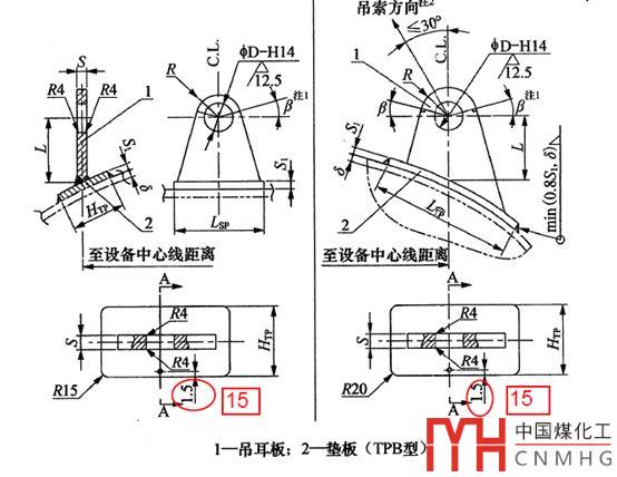 而HG/T 21574-2008中的TP型吊耳,對(duì)板式吊耳側(cè)向力方向給出了指導(dǎo)性的側(cè)傾角度小于15°。這個(gè)圖出現(xiàn)在規(guī)范上是一種誤導(dǎo),給很多遵守規(guī)范的工程師一個(gè)錯(cuò)覺,偏一些受側(cè)向力對(duì)于板式吊耳是沒有問題的。