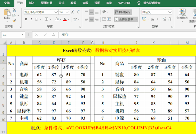 1、由于需要對比的兩個表格的基礎(chǔ)數(shù)據(jù)不完全對應(yīng),所以需要用Vlookup函數(shù)查詢出商品在對應(yīng)季度的“賬面”數(shù)據(jù),然后和庫存(C4)對比,如果不相等,則填充顏色。