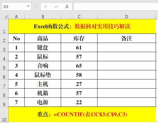 1、公式=COUNTIF(表1!C$3:C$9,C3)中的“表1”為需要對比的另一個工作薄的名稱。