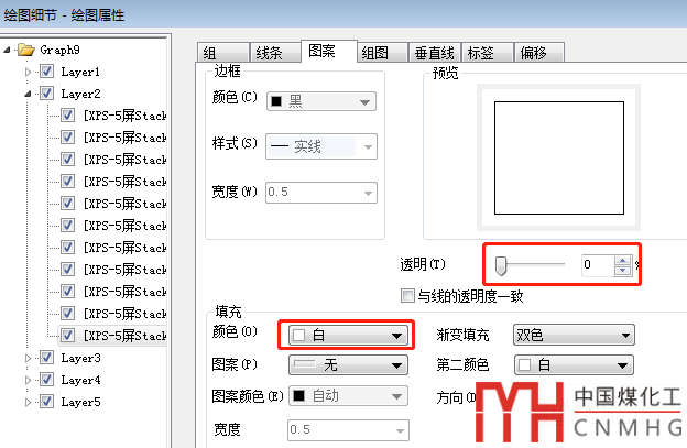現(xiàn)在對每一堆XPS曲線進行美化(線條顏色、線下填充半透明過渡色)。雙擊某一個圖層中的XPS曲線,在彈窗中點擊“線條”和“圖案”分別修改線條顏色和線下填充色。