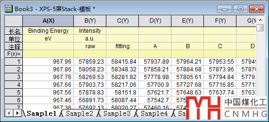 為了演示,僅將一組XPS數(shù)據(jù)復制成多組(重復使用),大家可以根據(jù)自己的數(shù)據(jù)安排整理數(shù)據(jù)表(如圖1)。