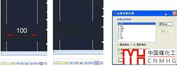 注釋可見性:顯示所有比例的注釋性對象。也就是說即使注釋對象比例跟當前空間的注釋比例不一樣,也會被顯示。單擊此按鈕,按鈕切換為僅顯示當前注釋比例的注釋對象,比如說當前空間的注釋比例為1:100,如果某個注釋對象的比例列表中沒有1:100,那這個對象就不會被顯示,如下圖所示。