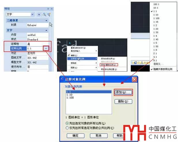 對象被設置為注釋性后,會多出一些參數(shù),例如注釋比例(objectscale)、文字會增加圖紙文字高度(設置打印時文字高度)和模型文字高度。對象的 注釋比例可以通過命令(objectscale)、屬性框(CTRL+1)、右鍵菜單來添加。如果圖中所有注釋性對象都采用相同的比例的話,直接在底部狀 態(tài)欄調整空間的注釋比例也可以將比例添加到對象的比例列表中,這種方式最簡單了。但如果希望有些注釋性對象在某種比例時不顯示或不改變大小,也可以不自動 添加。