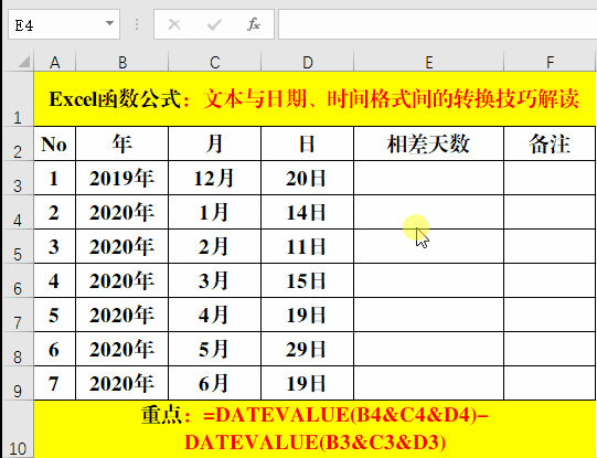 在目標單元格中輸入公式:=DATEVALUE(B4&C4&D4)-DATEVALUE(B3&C3&D3)。