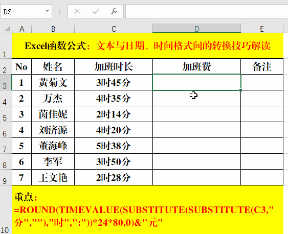 在目標單元格中輸入公式:=ROUND(TIMEVALUE(SUBSTITUTE(SUBSTITUTE(C3,"分",""),"時",":"))*24*80,0)&"元"。