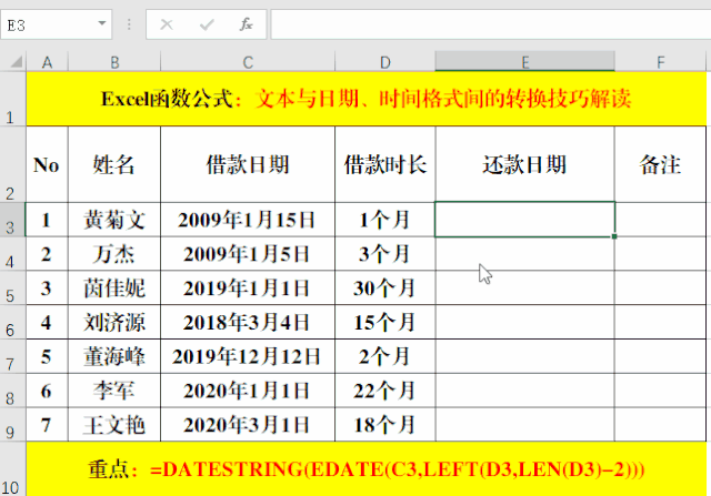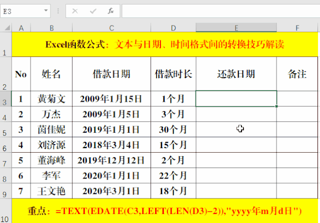 公式LEFT(LEN(D3)-2)用于從指定的單元格中提取數(shù)值,作為Edate函數(shù)的第二個參數(shù),最后使用Text函數(shù)將計算出的還款日期設置為日期格式。