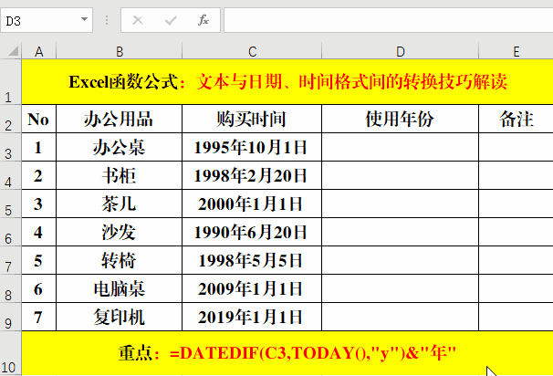 2、此函數(shù)還經(jīng)常用于計算年齡,如果“購買時間”為“出生日期”,則只需將公式=DATEDIF(C3,TODAY(),"y")&"年"中的“年”替換為“歲”即可。