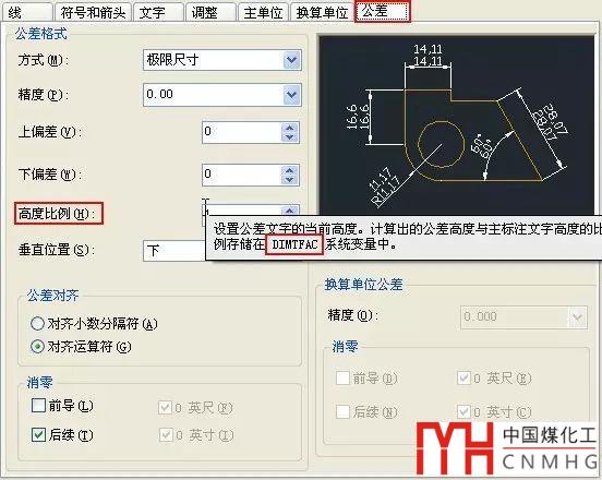 標(biāo)注中用于設(shè)置公差文字與常規(guī)標(biāo)注文字的高度比,這個(gè)一般情況下不必修改,如下圖所示。