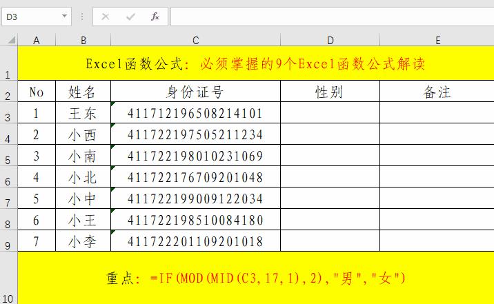 在目標(biāo)單元格中輸入公式:=IF(MOD(MID(C3,17,1),2),"男","女")。