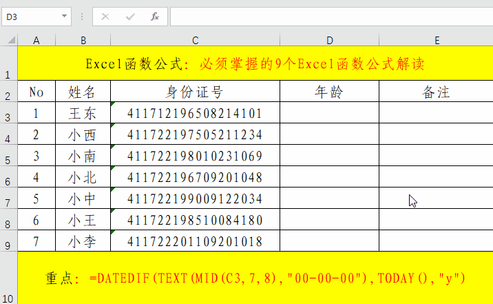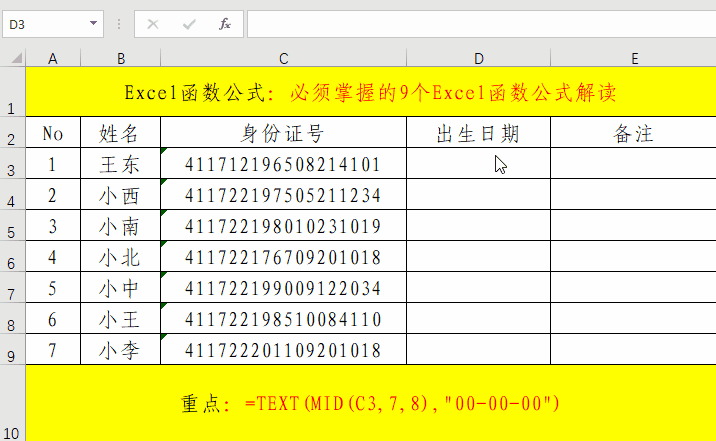 2、首先利用公式=TEXT(MID(C3,7,8),"00-00-00")提取出生年月,并用Today()獲取當(dāng)前的日期。