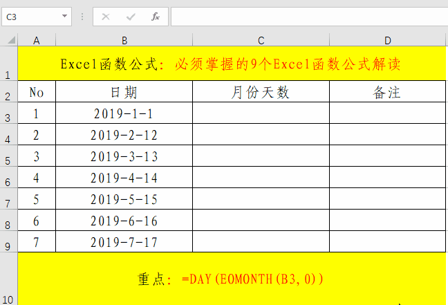 在目標(biāo)單元格中輸入公式:=DAY(EOMONTH(B3,0))。