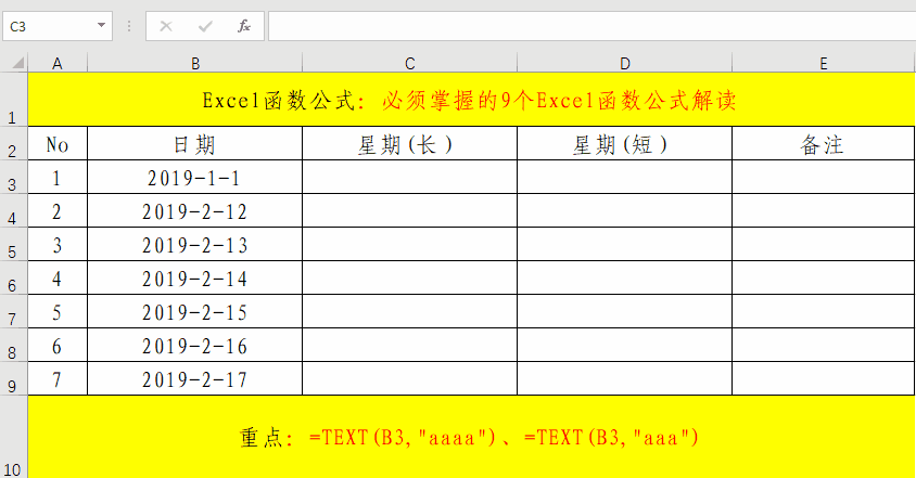 利用Text函數(shù)對指定的值進(jìn)行格式設(shè)置,“aaaa”為長日期,“aaa”為短日期。