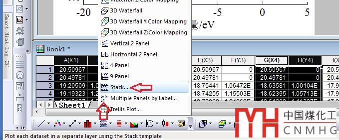 吸附前和吸附后2種狀態(tài)(即2張圖),每張圖中布置s,p,d3個樣品的曲線。因?yàn)樾枰獙Ρ妊芯繖M軸參量(E/eV),所以設(shè)置這2張圖共X軸,可采用共X軸Stack疊圖。