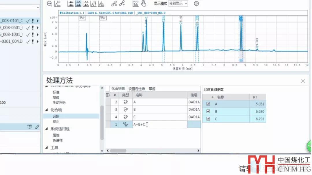 已命名化合物組被添加,并且化合物表右側(cè)出現(xiàn)已命名組參數(shù)表。如果需要該化合物組加和ABC的含量,只需要勾選ABC前面的復(fù)選框,將化合物組的名稱改成A+B+C?;衔锉碇胁辉傩枰鲈O(shè)置。