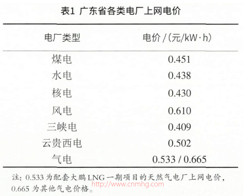 (5)從目前廣東省各類(lèi)典型電廠上網(wǎng)電價(jià)來(lái)看,廣東省天然氣價(jià)格在全國(guó)處于較高水平,且相對(duì)比其他發(fā)電類(lèi)型要高(如表1),天然氣燃料成本在發(fā)電成本中占比超過(guò)70%,燃料成本價(jià)格成為影響天然氣電廠經(jīng)營(yíng)最重要因素。