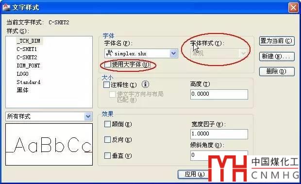 這個文字樣式設(shè)置的字體是simplex,“使用大字體”勾選框是灰的,而且右側(cè)“字體樣式”下拉列表被激活了,說明使用的是系統(tǒng)字體,這個字體不包括中文,國內(nèi)幾乎沒有人這么設(shè)置字體。而圖中的中文只所以能顯示,是CAD采取了自動替換的策略,應(yīng)該被替換成了宋體顯示了。我們選跟simplex類似的SHX字體試一下,就知道正常顯示是什么狀態(tài)。在字體名列表中選一種其他的SHX文件,然后在選回simplex.shx,如下圖所示。