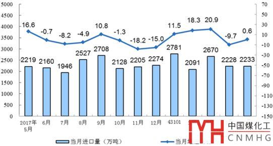 5月份,煤炭進口同比增長0.6%,進口2233萬噸,與上月基本持平。1~5月份,進口煤炭1.2億噸,同比增長8.2%。