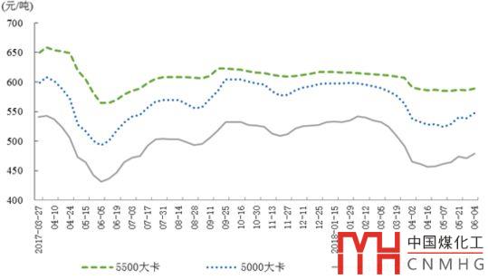 5月,煤炭價格實現(xiàn)探低回升。截至6月4日,秦皇島5500大卡煤炭平倉價為每噸589元,比4月下旬上漲2元;5000大卡每噸547元,上漲18元;4500大卡煤炭每噸471元,上漲22元。