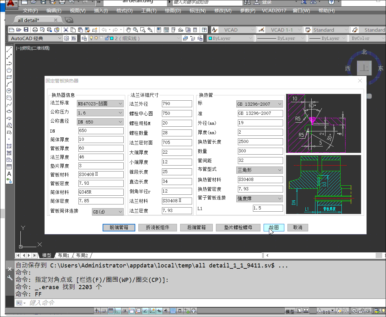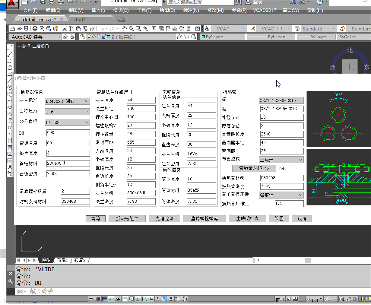 VCAD-2017更新了固定管板換熱器BEM和U型管換熱器BEU的直接成圖。一般的換熱器我們在做設(shè)計的時候,都是根據(jù)設(shè)備法蘭的尺寸來設(shè)計管板的配對尺寸,如果能夠依據(jù)少量的尺寸,繪制出換熱器外形,并出具一些按比例的圖紙,那么能夠大大減輕換熱器的設(shè)計工作量。無論是報價,做工程圖,做詳細設(shè)計,都會大大提高設(shè)計效率。