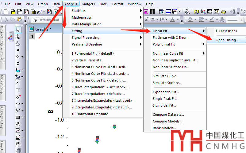 選擇“Analysis-Fitting-Polynomial Fit-Open Dialog...”進(jìn)行多項(xiàng)式擬合。具體演示如下: