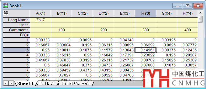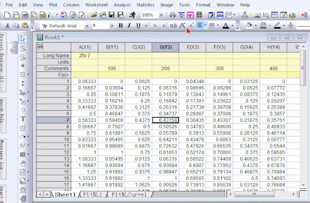 Origin的擬合功能是對(duì)一組XY數(shù)據(jù)進(jìn)行擬合,因此,我們需要先復(fù)制一個(gè)數(shù)據(jù)表,將不同樣條數(shù)據(jù)粘貼在一組XY列中。
