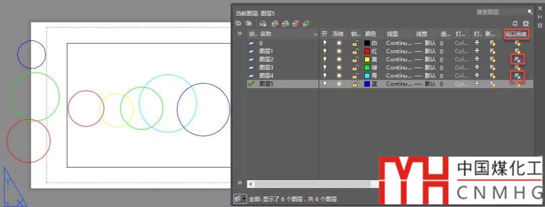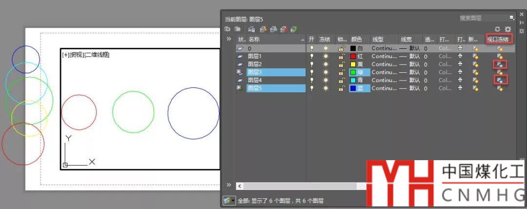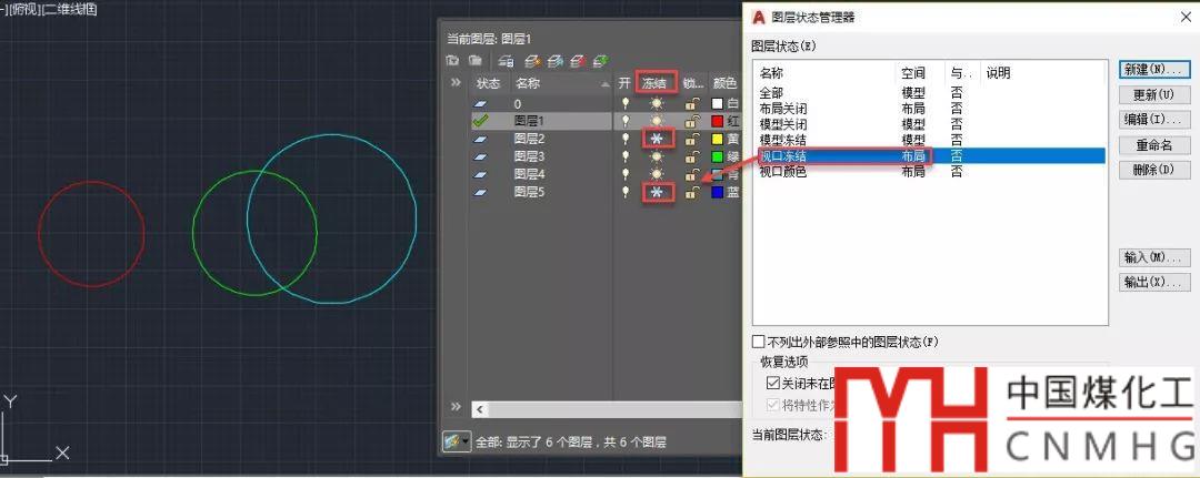 切換到布局空間,將所有圖層都打開。先不進(jìn)入視口,恢復(fù)此圖層狀態(tài),可以看到在圖紙空間中圖層2和圖層4上的圓消失了,而視口內(nèi)的的圓仍顯示,打開圖層狀態(tài)管理器,可以看到圖層2和圖層4并未關(guān)閉,而是被視口凍結(jié)了,如下圖所示。