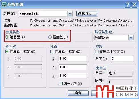 插入外部參照(xattach)時時,有兩種方式:附加型和覆蓋型,如下圖所示。