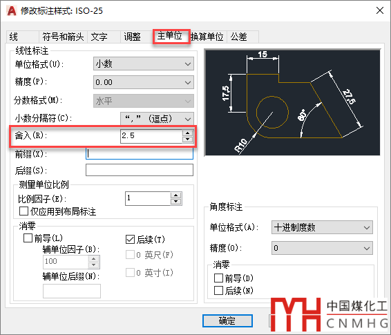 比如上面截圖中我們將舍入值設(shè)置成2.5,如果此時將精度設(shè)置為不保留小數(shù)的話,標(biāo)注也會發(fā)生變化,如下圖所示。