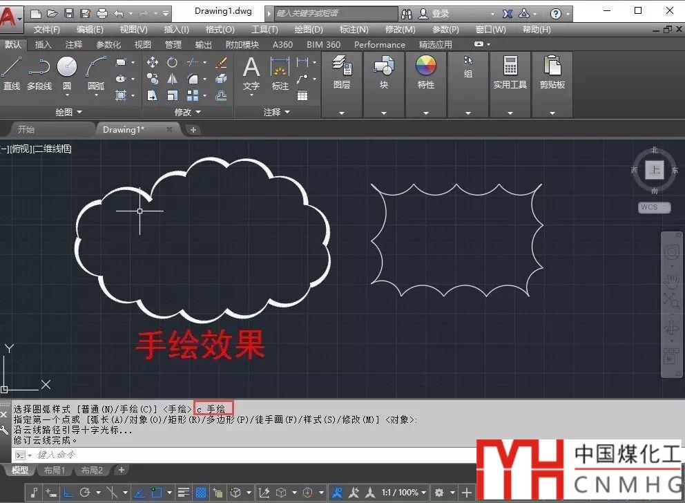執(zhí)行云線命令,輸入S,回車,設(shè)置云線樣式;輸入C,回車,改成手繪樣式,然后我們可以在圖中繪制一條云線,看看手繪樣式的效果,如圖所示。