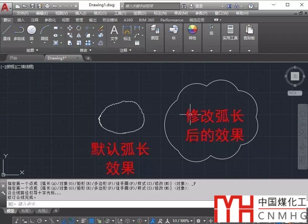 執(zhí)行云線命令后,輸入A,回車,就可以設(shè)置最小弧長,默認(rèn)的弧長是0.5,我們可以手動(dòng)輸入最小弧長,也可以在圖中通過定義兩點(diǎn)來定義弧長。最小弧長設(shè)置合適的話,云線的圓弧段會(huì)減少很多,如圖所示。