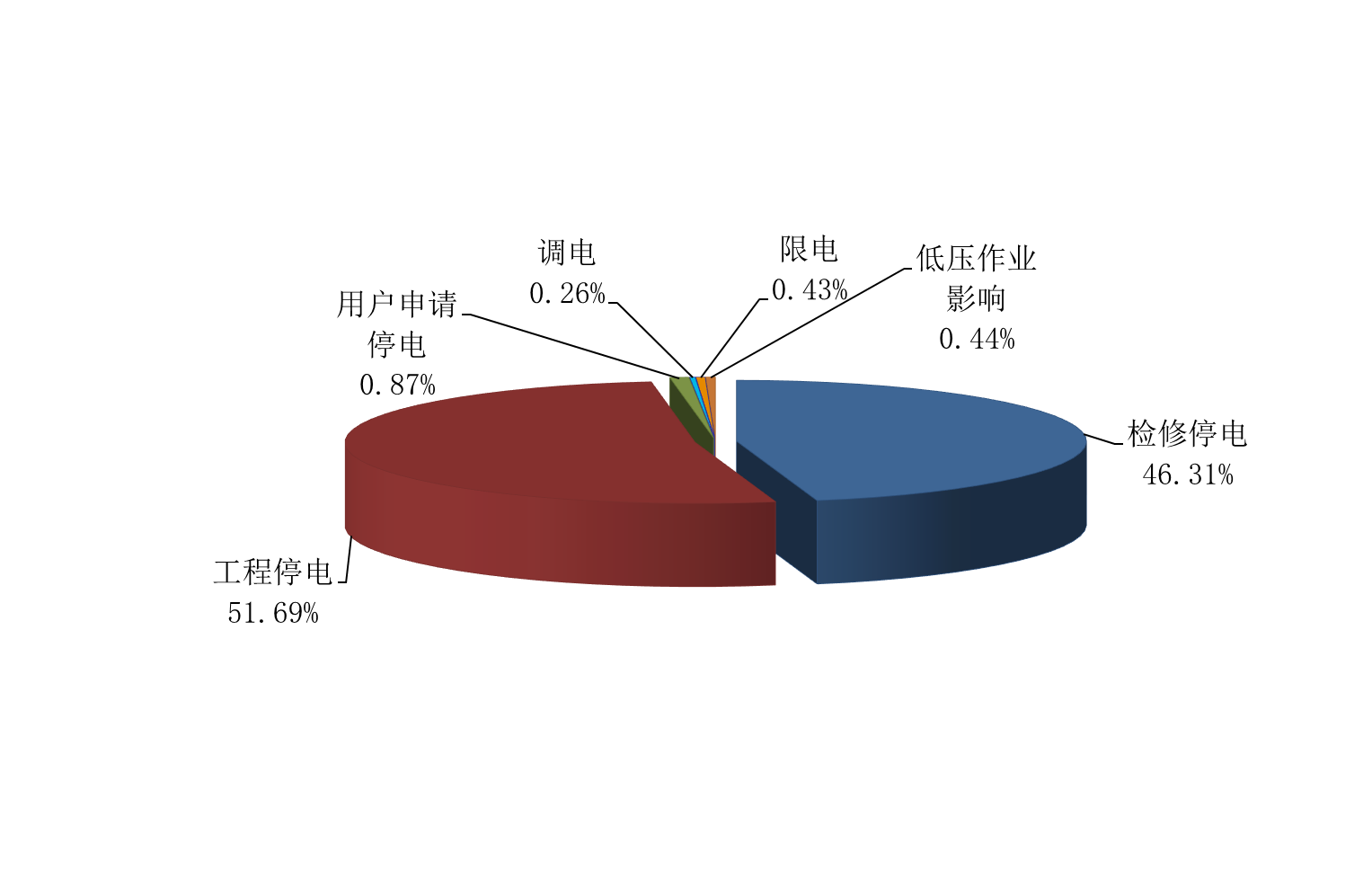 2019年,“計(jì)劃停電”仍是造成我國(guó)中壓用戶(hù)停電的主要原因,占用戶(hù)總停電時(shí)間的59.84%,影響用戶(hù)平均停電時(shí)間為8.21小時(shí)/戶(hù)。其中,工程與檢修停電分別占預(yù)安排總停電時(shí)間的51.69%、46.31%;“故障停電”占總停電的40.16%,影響用戶(hù)平均停電時(shí)間為5.51小時(shí)/戶(hù)。